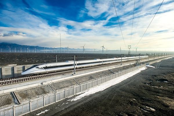 圖為中車四方股份公司研制的CRH2G耐高寒抗風(fēng)沙動(dòng)車組運(yùn)行在蘭新高鐵